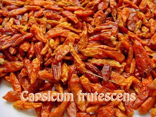 Capsicum frutescens ist eine Pflanzenart der Gattung Paprika aus der Familie der Nachtschattengewächse. Es gibt viele verwandte Kulturpflanzenarten, wie z. B. Kartoffeln, Tomaten und Auberginen. Typisch für Capsicum frutescens sind die stets aufrecht an der Pflanze stehenden Blüten und Früchte. Als Cayennepfeffer (sprich: kaˈjɛn) werden gemahlene Chilis bezeichnet. Als Grundlage dafür dienen meist die getrockneten, scharfen Früchte der Chilisorte Cayenne - eine der Art Capsicum annuum zugeordnete Chili-Varietät. Der Name stammt aus der Sprache der Tupi (Brasilien) und bedeutet in etwa Scharfer Pfeffer. Die Pflanze wurde von Kolumbus und anderen Seefahrern aus Indoamerika nach Europa gebracht, und später auch aus Indien importiert. Der Hauptgrund jener Reisen war die Suche nach den Gewürzinseln im Indischen Ozean. Man fand stattdessen Amerika und damit viele neue Nahrungsmittel und Gewürze, wie die Kartoffeln, Tomaten, den Mais, Paprika und deren Verwandte und den Cayenne-Pfeffer. Botanisch gesehen, hat Cayenne nichts mit Pfeffer zu tun und hat als Gewürz nur die Schärfe gemeinsam. Bei den Criollos von Bolivien und Peru spielen die brennendscharfen Capsicum-Arten seit jeher eine wichtige Rolle bei der Speisezubereitung, wie auch bei den Mannbarkeitsriten (erhöht den Blutstrom). Wir kennen Cayenne als scharfes Gewürz. Es fördert die Verdauung, lindert Magen- Darmbeschwerden und kann bei Herzproblemen Linderung verschaffen. Capsiacin hat die Fähigkeit Heliobacter pylori und andere Magen- Darm-Bakterien abzutöten. Es werden auch Erfolge bei akuten Herzbeschwerden, ja sogar bei Herzattacken gemeldet. Im akuten Fall vermögen 2-3 Cayenne-Kapseln - oder das Pulver - mit warmem Wasser eingenommen, den Anfall sofort zu lindern. Regelmässig angewandt stärkt Cayenne die Abwehrkräfte und lindert Frösteln (ein Kältegefühl am ganzen Körper), da er wärmt und den Blutkreislauf anregt. Cayenne ist reich an Vitamin A, C, PP, B-Komplex, Carotin, Kalzium, Kalium, Phosphor und Eisen. Verantwortlich für die Schärfe ist das Alkaloid Capsiacin. Cayenne gleicht den Blutdruck aus, verbessert die Gerinnungsfähigkeit des Blutes, wirkt antibiotisch und antiviral, fördert den Leberstoffwechsel und den Gallenfluss. Jüngste Untersuchen lassen vermuten, dass Cayenne bei Gürtelrose und Migräne schmerzstillend wirkt. Das Gewürz wird durch das Trocknen und Pulverisieren der Früchte gewonnen. In unseren Breitengraden sollte die Steigerung bis zur Höchstdosis langsam erfolgen und anschliessend nur kurzfristig angewenset werden. Beim eventuellen Auftreten einer starken Reaktion bringt ein geraffelter Apfel sofortige Besserung. Schwangere und Nierenkranke sollten Cayenne nicht in therapeutischen Dosen verwenden.